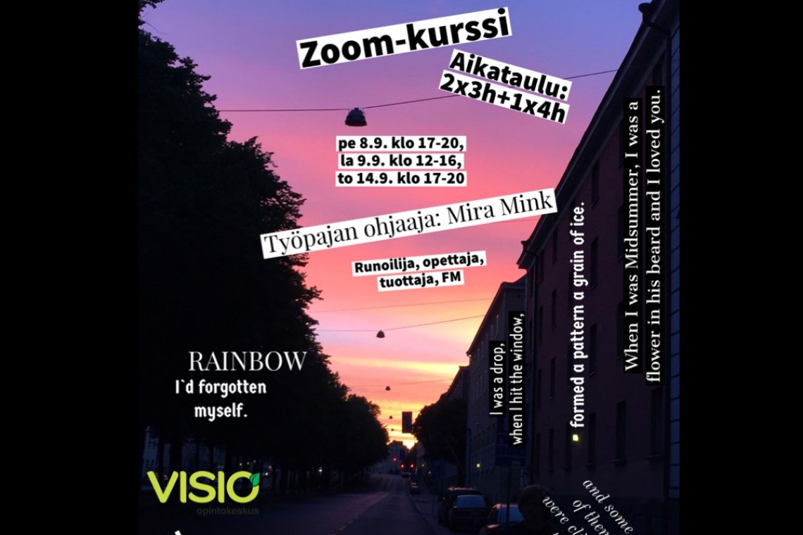 Kurssin vetäjä: runoilija Mira Mink, FM, opettaja, runoilija (oik.nimi Mirka Keini) Mira Mink on helsinkiläinen taiteilija, opettaja, tuottaja ja runoilija. Mink on julkaissut viisi omakustannetta viimeisimmät: Äänikirjamaisesti I ja Collection of Photopoetry (2022). Minkin taideprojekteja ovat taidenäyttelyt ja avoin lava-tapahtumien järjestäminen. Kuvarunoteoksen runokuvateoksia olivat esillä lyhyesti jo Venice Artfactoryyn kuuluvassa ”Navigating the city” -näyttelyssä - ne ovat käännettyinä myös italiaksi. Esillä myös täällä julkaistun kirjan lisäksi: https://express.adobe.com/page/ocfxwfHBaLuSW/