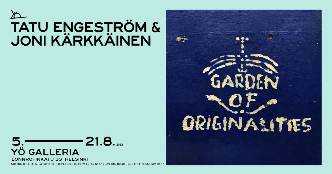 Garden of originalities - utställningen är ett samarbete mellan Tatu Engeström och Joni Kärkkäinen. Utställningen består både av en gemensam installation som byggs upp av olika arkitektoniska element samt av personliga verk från konstnärerna. Utgångspunkten för samarbetet har varit duons relation till den ständigt föränderliga staden. Verken i utställningen är gjorda av material som samlats in från byggarbetsplatser och rivningsplatser, så som blått byggarbets staket, avfallsaluminium och bortglömda ädelträ plankor.