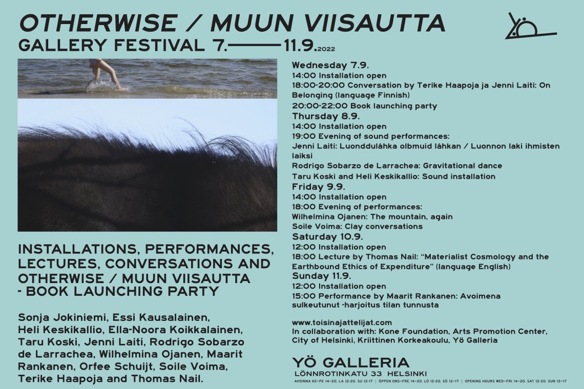 Installaatioita, esityksiä, luentoja, keskusteluja ja “OtherWise / Muun viisautta” -kirjan julkistamisjuhla.