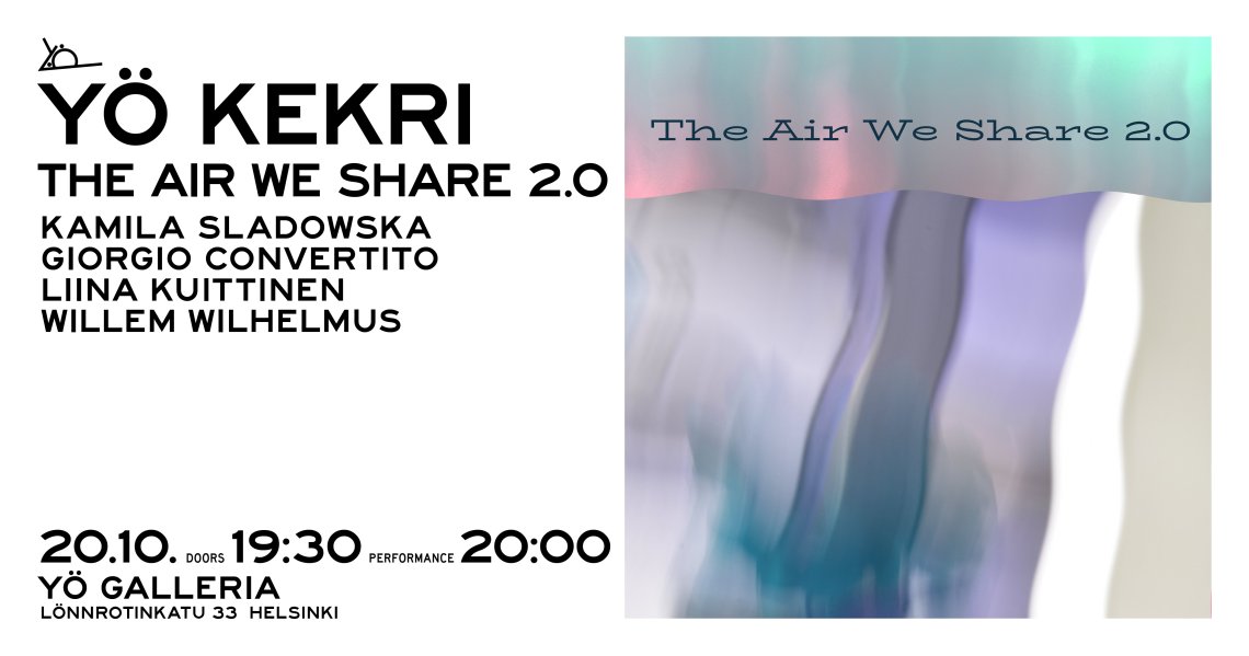 The Air We Share 2.0 tapahtuma on tarkoitettu radikaaliksi lääkkeeksi yhteiskuntaa vaivanneeseen tokkuraisuuteen, jonka aiheuttivat Covid19 ja nyt lisäksi tämä hirvittävä sota. Meidän on kokoonnuttava jälleen taiteen äärelle, tarkemmin sanottuna kokeellisen elävän taiteen äärelle.